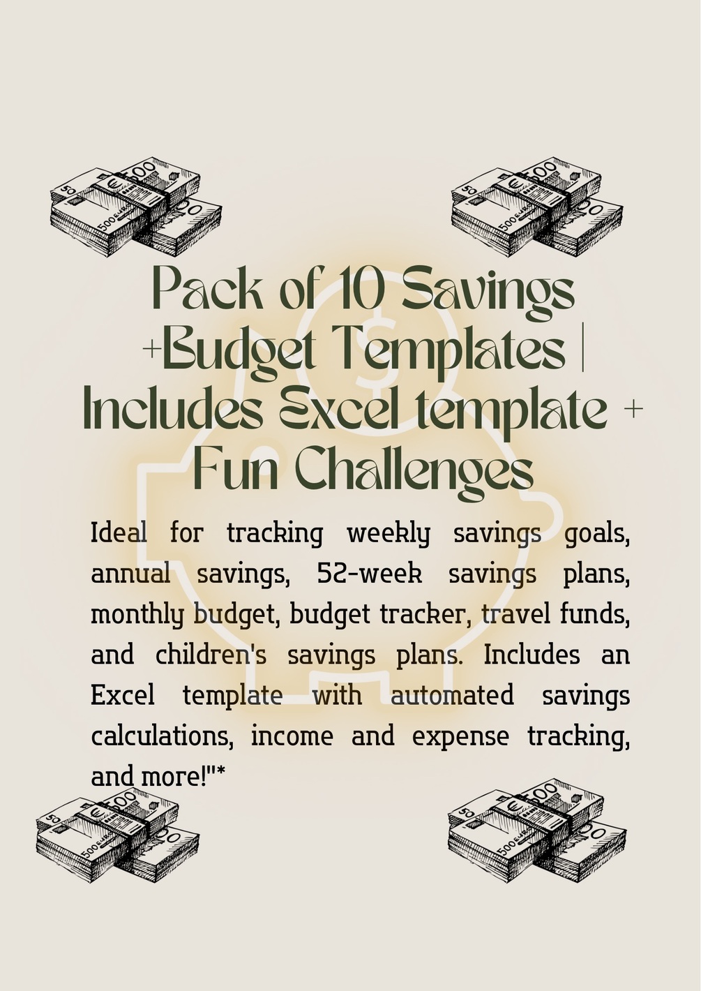 This pack contains 12 beautifully designed templates ready for digital use or printing. You'll find savings options tailored for different needs and lifestyles, including: ✅ Monthly Savings Challenges (30-day and 31-day plans) ✅ Weekly & Annual Savings Planners ✅ Category-Based Savings Trackers (travel, school expenses, major financial goals) ✅ Children’s Savings Challenges ✅ Holiday Savings Plan ✅ Automated Excel Savings Template track your savings, income, and expenses seamlessly! *(File attached—check if you’ve met your monthly goal!)